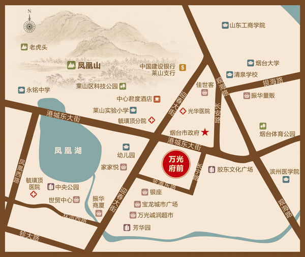 2010年3月,煙臺(tái)市級(jí)重點(diǎn)項(xiàng)目和萊山區(qū)五個(gè)社會(huì)事業(yè)重點(diǎn)項(xiàng)目之一的膠東文化廣場(chǎng)在萊山區(qū)開(kāi)工奠基,總投資23.85億元,其投資、規(guī)模、功能均創(chuàng)我市新高;2013年10月,膠東文化廣場(chǎng)已經(jīng)盛裝開(kāi)業(yè),其集文化、藝術(shù)、旅游、休閑、娛樂(lè)、健身等為一體,全部建成后將成為富有膠東文化特色的大型主題公園。萬(wàn)光府前花園與膠東文化廣場(chǎng)僅一路之隔,入住府前花園,不僅可與煙臺(tái)第二座"文化中心"為鄰,還可享受周邊豐富的醫(yī)院、高校、銀行配套設(shè)施資源。
