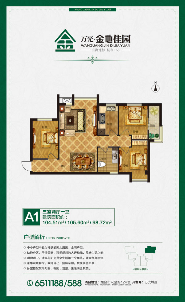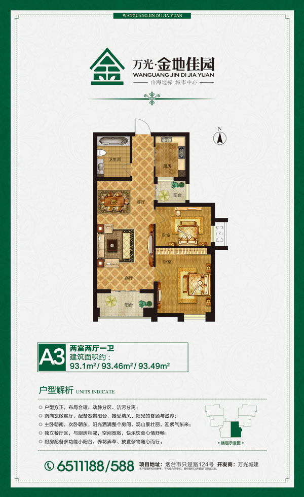 萬光金地佳園位于煙臺(tái)中軸線—南大街西線,匯聚煙臺(tái)中心居住區(qū)的繁華生活,3分鐘到達(dá)煙臺(tái)核心商務(wù)區(qū)。4棟30層板式宅第傲立城市中心,近百米的黃金區(qū)域標(biāo)桿高度,南山北海,一覽無余?,F(xiàn)代歐式建筑,經(jīng)典建筑外立面,全落地大窗。獨(dú)有薄版建筑格局,戶戶景觀一線,近觀園林、山色,遠(yuǎn)眺都市、海景。振華商圈、百盛商圈、三站商圈等核心商圈匯集,大潤(rùn)發(fā)、沃爾瑪超市近在附近,銀行、學(xué)校、醫(yī)院、書店、餐館環(huán)繞周邊,購物、休閑、美食一應(yīng)俱全。項(xiàng)目毗鄰煙臺(tái)重要交通動(dòng)脈——只楚路與同三高速,公交線路密集,公路暢通無阻,順暢貫通五區(qū),連接周邊縣市。城市中心,生活一步到位