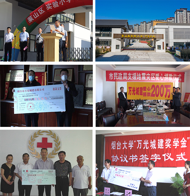 不忘初心,不負(fù)韶華。20余年來(lái),萬(wàn)光城建始終恪守企業(yè)公民職責(zé),在公司創(chuàng)始人姜振山、董事長(zhǎng)姜松青同志傾力倡導(dǎo)下,萬(wàn)光城建在扶貧救災(zāi)、捐資助學(xué)、襄助公益等方面不斷身體力行,2019年,由萬(wàn)光城建出資5000萬(wàn)元捐建的萊山區(qū)實(shí)驗(yàn)小學(xué)萬(wàn)光校區(qū)順利建成投用,開啟了萊山區(qū)建區(qū)以來(lái)社會(huì)力量捐建學(xué)校的先河,展現(xiàn)了煙臺(tái)本土企業(yè)的社會(huì)責(zé)任與大愛擔(dān)當(dāng);2020年初,在新冠疫情防控的關(guān)鍵時(shí)刻,萬(wàn)光城建主動(dòng)發(fā)揚(yáng)企業(yè)表率,率先向萊山區(qū)紅十字會(huì)捐贈(zèng)人民幣100萬(wàn)元及防疫物資近30萬(wàn)元,萬(wàn)光城建旗下萬(wàn)光物業(yè)公司、萬(wàn)光誠(chéng)潤(rùn)超市從大年初一全員上崗,在確保小區(qū)安全健康的同時(shí),平價(jià)供應(yīng)居民日常生活物資,以強(qiáng)烈的大愛擔(dān)當(dāng)和務(wù)實(shí)有力的舉措,切實(shí)履行企業(yè)社會(huì)責(zé)任。此外,公司還先后向煙臺(tái)市紅十字會(huì)、萊山區(qū)紅十字會(huì)、煙臺(tái)大學(xué)、萊山區(qū)曹家莊小學(xué)、煙臺(tái)向日葵殘疾兒童基地、煙大附小等單位及社會(huì)弱勢(shì)群體踴躍奉獻(xiàn)愛心,累計(jì)捐款近6000萬(wàn)元。“5.12”汶川地震后,公司傾企業(yè)與員工所能,第一時(shí)間捐資205萬(wàn)元,創(chuàng)下連續(xù)5日全市企業(yè)捐款數(shù)額之最,生動(dòng)詮釋了“責(zé)任企業(yè)、責(zé)任地產(chǎn)”的深刻內(nèi)涵,被煙臺(tái)市政府授予“煙臺(tái)慈善獎(jiǎng)•最具愛心慈善捐贈(zèng)單位”。